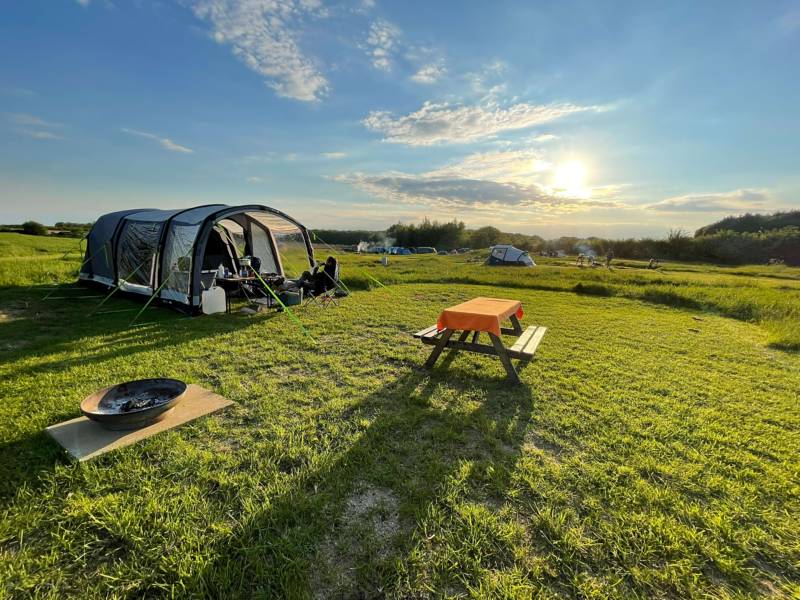 Circular pitches here are mown into the long wild grass in clusters of three, with each cluster provided with a shared picnic table and firepit for free use (just the spot for quiet morning coffees and evenings toasting marshmallows while the sun sets).