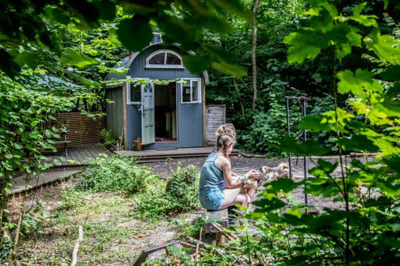 The Shepherds Hut is situated in a clearing in the woods near to The Cabinand The Wagon. In the main living area the sofa pulls out into a full-size double bed and upstairs the loft bed sleeps 2 children (If they’re happy in a top bunk they’ll be fine up there) the roof of the den is blackboard and lots of colourful chalks are provided for their masterpieces! There’s a little wood burner and a double gas hob. We try to give everything we create its own unique feel, so the Hut, aside from being stunningly beautiful, has a hot water outside wet room along with hot running water inside too, and in the clearing just off the deck is the fire pit where you can BBQ our famous farm grown meat. A hammock is provided which you can sling between two trees and laze away the day. Tucked into the corner of the clearing is the wonderful ‘tree-bog’ toilet which now it’s up rather looks like a little chapel!