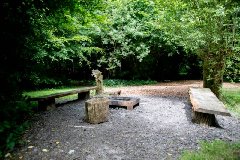 The Encampment is our woodland camping area around a fenced natural pond, three beautiful woodland camping pitches, each can take a large family tent , each has a fire pit, with wooden bench seats and if you book all three woodland camping pitches you will have this area to yourselves. Has its own tree bog loo and covered washing up area.