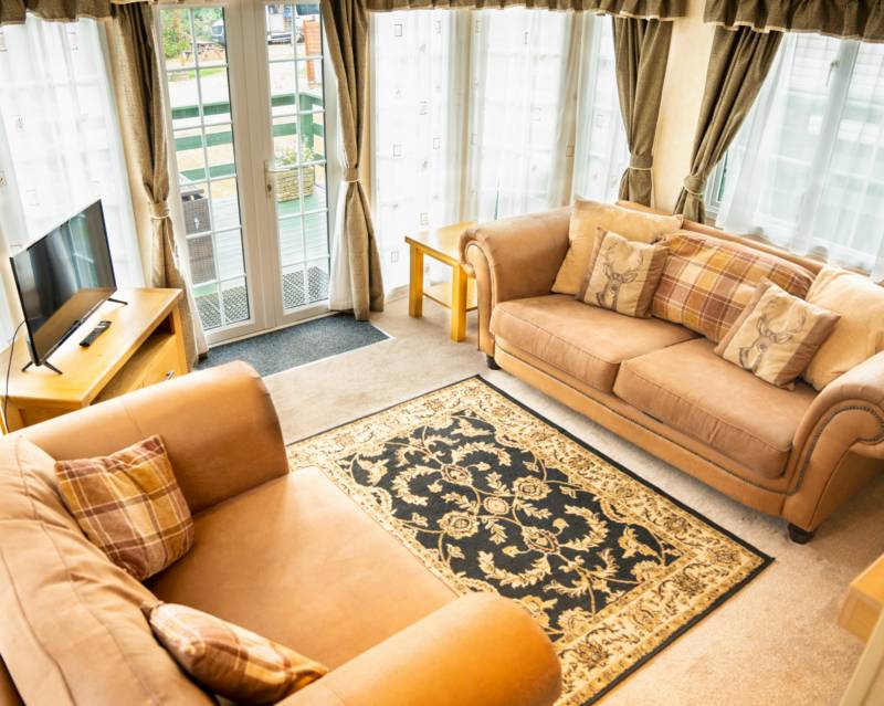 The Oaks offers a spacious self-catering experience. Incorporating one double and one twin room. This caravan boasts a good size shower room as well as an ensuite toilet in the master bedroom. The kitchen includes a full size fridge/freezer and a dining area. The lounge area is beautifully light with large windows and double doors onto the decking area. There are two TVs in the property, one internet ready and another with DVD player in the main bedroom.