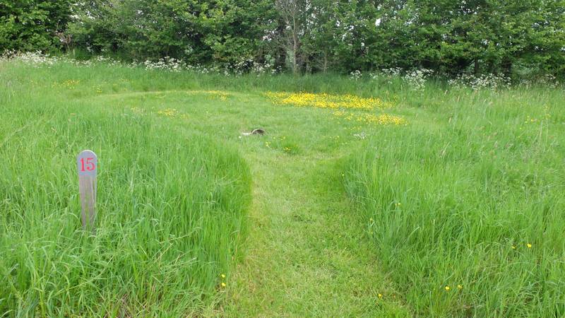 A circular mown camping area in the long grass (approximately 10 metres in diameter), complete with a fire-pit.