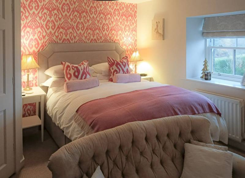 This double room overlooks the south facing garden, with king size bed, dressed in Sanderson bedding. Sofa, 32 inch smart TV, tea and coffee facilities with fridge, radio alarm clock, hairdryer and WiFi available. Ensuite with walk in shower.